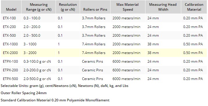 Checkline ETX / ETPX數(shù)據(jù)記錄張力儀專為在各種應用中精確測量細金屬絲,紗線和纖維上的張力而設計。滾子或陶瓷銷釘安裝在長的“指狀物”的末端,使用戶可以在有限的進入空間內(nèi)或在幾條線緊緊排列時(例如在經(jīng)紗板上)測量張力。提供五(5)個測量范圍,最大容量為2000克或cN。1000 g和2000 g型號分別在短銷(手指)上安裝了直徑7.4mm的V型槽滾輪,而不是標準長度的銷(手指)和3.7 mm微型滾輪。