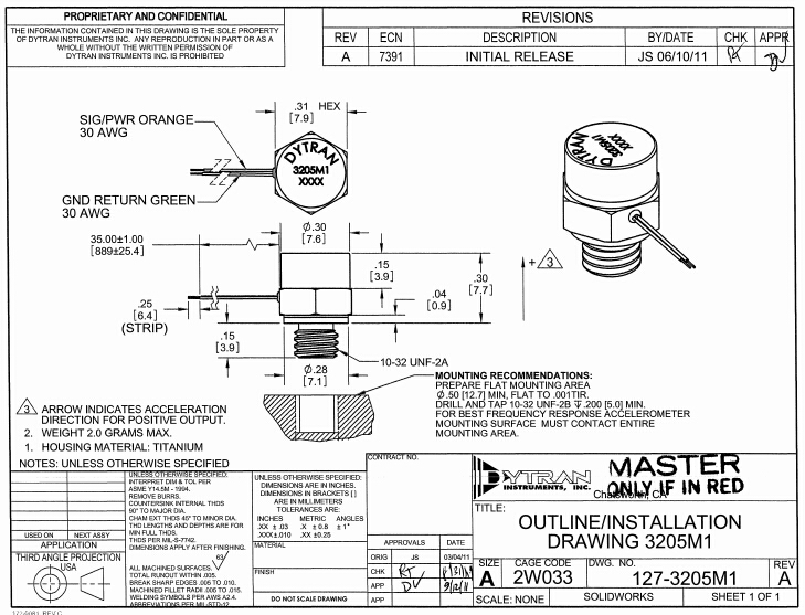 美國(guó)Dytran3205M1加速度傳感器尺寸圖: