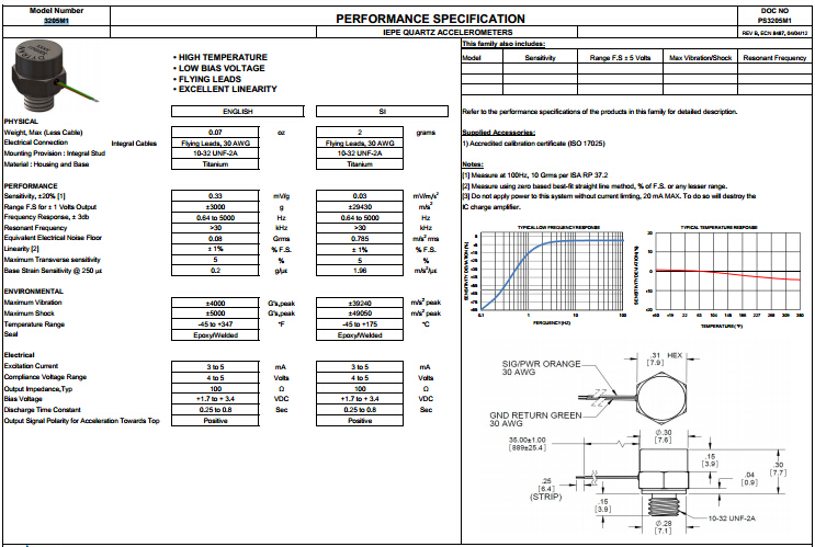 美國(guó)Dytran3205M1加速度傳感器的性能規(guī)格參考圖: