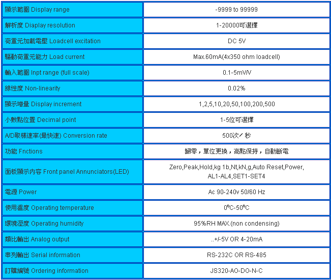臺灣JIHSENSE JS-320_JS-320稱重顯示控制器可標(biāo)配本品牌所有模擬荷重元規(guī)格: