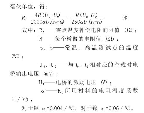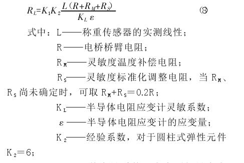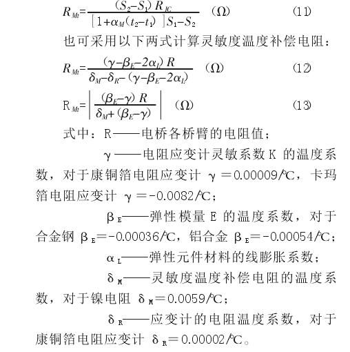 實(shí)踐證明,對(duì)于普通準(zhǔn)確度級(jí)別的稱重傳感器,只要彈性元件結(jié)構(gòu)、尺寸、材料、電阻應(yīng)變計(jì)、制造工藝完全一樣,可以采用由抽樣方法經(jīng)過試驗(yàn)取得靈敏度溫度補(bǔ)償電阻最佳值進(jìn)行補(bǔ)償,而不必逐一反復(fù)測(cè)試調(diào)整。對(duì)于高準(zhǔn)確度稱重傳感器和在工作溫度變化大 (例如-15℃~50℃)的環(huán)境下工作的稱重傳感器,為了得到較高的補(bǔ)償精度,使其在工作溫度范圍內(nèi)具有較小的靈敏度溫度誤差,必須逐個(gè)進(jìn)行測(cè)試調(diào)整。此時(shí)焊入稱重傳感供橋電路的靈敏度溫度補(bǔ)償電阻 RMt應(yīng)比理論計(jì)算值大 10%~15%,為過補(bǔ)償。然后在其上并聯(lián)一個(gè)高精度、低溫度系數(shù)的金屬膜電阻 RP,來改善 RMt的非線性,通常稱為靈敏度溫度補(bǔ)償?shù)木€性化調(diào)整電阻。進(jìn)行補(bǔ)償時(shí),可用精密電阻箱代替線性化調(diào)整電阻便于精密調(diào)整,待求得最佳調(diào)整電阻值時(shí)再用金屬膜電阻替換。必須強(qiáng)調(diào)指出,補(bǔ)償測(cè)試溫度點(diǎn)至少應(yīng)選取三點(diǎn),即最高工作溫度、最低工作溫度和常溫,而不易只選取常溫和最高工作溫度兩個(gè)點(diǎn),這是因?yàn)殪`敏度溫度補(bǔ)償鎳電阻與溫度不成線性關(guān)系。
