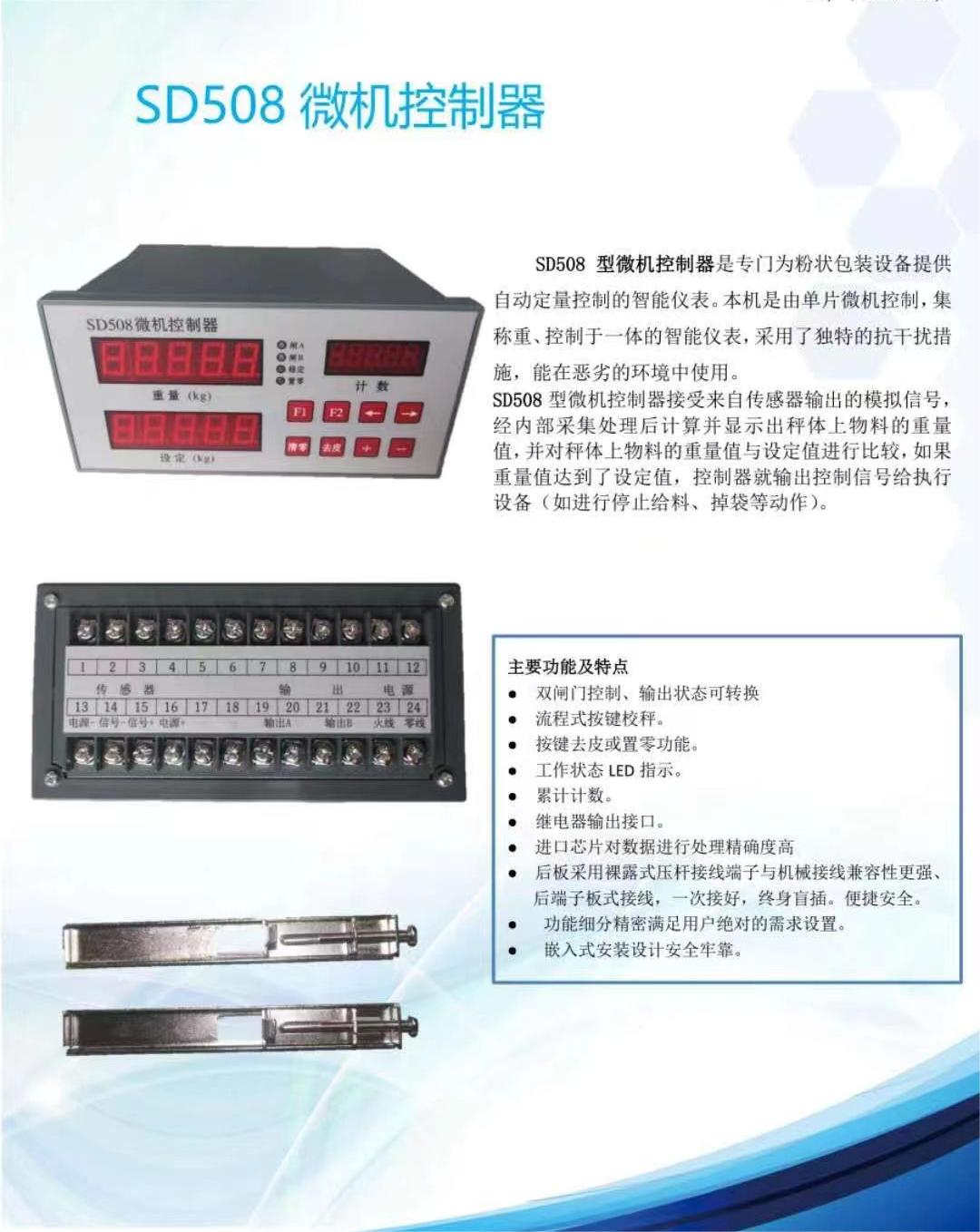 TRf廣州南創(chuàng)電子科技有限公司SD508型微機(jī)控制器接受來(lái)自傳感器輸出的模擬信號(hào),經(jīng)內(nèi)部采集處理后計(jì)算并顯示出秤體上物料的重量值,并對(duì)秤體上物料的重量值與設(shè)定值進(jìn)行比較,如果重量值達(dá)到了設(shè)定值,控制器就輸出控制信號(hào)給執(zhí)行設(shè)備(如進(jìn)行停止給料、掉袋等動(dòng)作)。