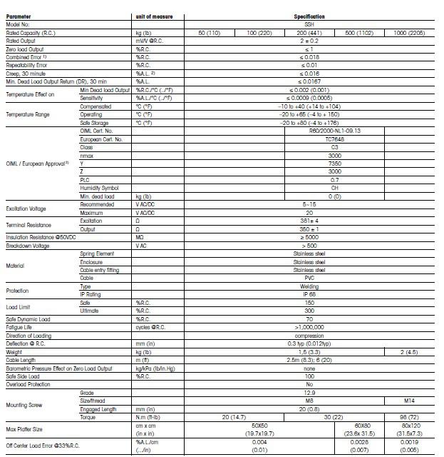 托利多稱重傳感器SSH-100kg技術(shù)指標(biāo):