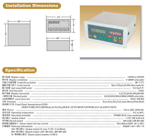 臺(tái)灣JIHSENSE JS-2200稱重顯示控制器規(guī)格圖: