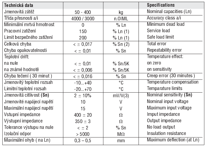 標(biāo)稱(chēng)靈敏度(Sn): 2± 10% mV/V額定輸入電壓: 10 V最大輸入電壓: 15 V輸入阻抗: 400 ± 200 Ohm輸出阻抗: 350 ± 30 Ohm空載輸出<±2%Sn絕緣電阻 > 5000 MOhm靈敏度溫差影響 < ±0.006%Sn/5K蠕變誤差(30分鐘)<±0.016 %Sn溫度補(bǔ)償: -10 to +40 °C溫度范圍: -20 to +70 °C最大偏差(at Ln):0.3 - 0.5mm