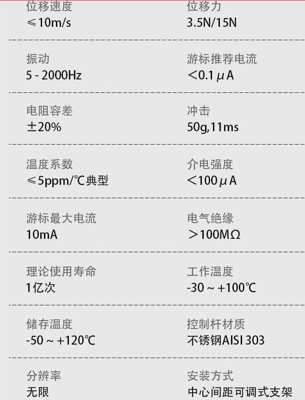 BaN廣州南創(chuàng)電子科技有限公司LTC-M-0450-S-XL0396 LTC-M-0475-S-XL0396拉桿式直線位移傳感器杰佛倫相關(guān)特點(diǎn):BaN廣州南創(chuàng)電子科技有限公司杰佛倫gefran拉桿式直線位移傳感器(別名:杰佛倫電子尺,杰佛倫電阻尺,杰佛倫電位器,杰佛倫位移傳感器)原理:電位計(jì)原理,傳感器保證在所有條件下的高可靠性,機(jī)械結(jié)構(gòu)使LTC適合應(yīng)用在強(qiáng)烈振動(dòng)的情況中,超出理論電氣行程后無電氣信號(hào)輸出變化安裝更簡單。輸出直流電壓信號(hào),也可以通過內(nèi)置或者外置的變送模塊講信號(hào)轉(zhuǎn)換成標(biāo)準(zhǔn)的0-5V、0-10V或者4-20mA直流信號(hào),也可以遠(yuǎn)距離傳輸控制要求。杰佛倫gefran位移傳感器廣泛應(yīng)用于注塑機(jī),立式注塑機(jī)和其他許多生產(chǎn)設(shè)備。