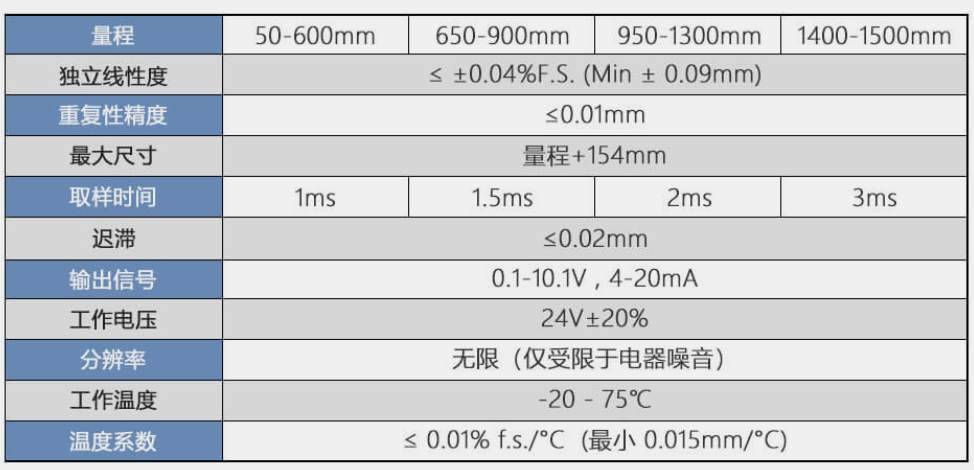 U2r廣州南創(chuàng)電子科技有限公司杰佛倫磁致伸縮位移傳感器MK4-A-A-1000-N MK4-A-B-150-E相關(guān)特點(diǎn): U2r廣州南創(chuàng)電子科技有限公司MK4系列磁致伸縮位移傳感器采用磁致伸縮技術(shù)的非接觸式線性位置傳感器。游標(biāo)上不存在電觸點(diǎn),因此不會發(fā)生磨損,使用壽命幾乎是無限長。小巧緊湊,易于安裝。完全不受外部介質(zhì)影響,可用在高污染和粉塵較大的惡劣環(huán)境中。出色的線性度,重復(fù)性好,耐機(jī)械振動和沖擊。主要特點(diǎn):絕對測量傳感器;非接觸式傳感器,使用壽命更長;行程范圍:50 - 4,000mm;通過不銹鋼接頭快速插接;滑動式或浮動式磁性游標(biāo);游標(biāo)位置: 單或雙(最短距離 75mm);工作溫度: -30 - +75°C;耐振 (DIN IEC68T2/6 12g);防護(hù)等級:IP67;電磁兼容性認(rèn)證 CE (EN 50081-2 50082-1);電源 24Vdc ± 20%;內(nèi)部結(jié)構(gòu)經(jīng)過改進(jìn),帶有安全緊固螺釘。