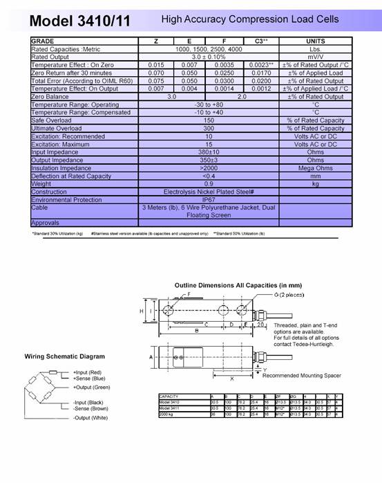 美國(guó)Tedea-Huntleigh 3410-2000LB稱重傳感器技術(shù)參數(shù)圖: