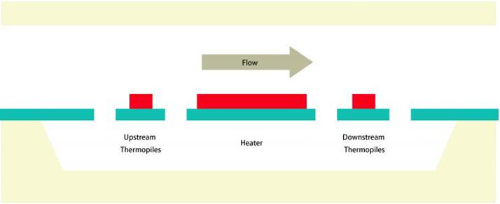 MEMS流量傳感器可利用單個(gè)或多個(gè)加熱器和溫度傳感器來制造。一種簡單的制造方法就是兩個(gè)溫度傳感器圍繞一個(gè)加熱器,并對稱地放置在左右兩邊。當(dāng)加熱器(即電阻)通過電流加熱時(shí),加熱器周圍就會形成穩(wěn)態(tài)溫度曲線。當(dāng)氣體(介質(zhì))不流動時(shí),對稱的兩個(gè)溫度傳感器就會檢測到相同的溫度。當(dāng)氣體流動時(shí)(如從左到右),熱空氣從左向右吹,此時(shí),傳感器的溫度讀數(shù)就是右邊高于左邊。由于溫差與流速成正比(低流速時(shí)呈線性&高流速時(shí)呈非線性),我們可通過測量兩個(gè)溫度傳感器的溫差來確定流量。