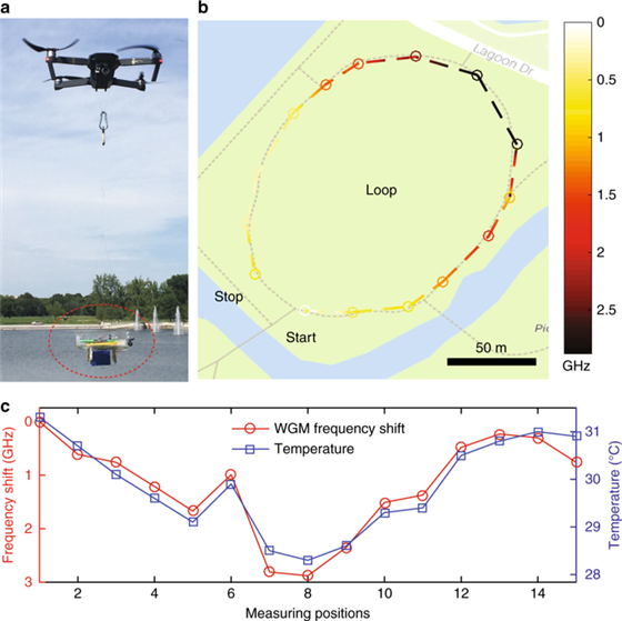 當無人機從一個測量位置飛到另一個測量位置時,WGM傳感器的共振頻率由于溫度變化而發(fā)生變化,共振頻率的變化如圖4b所示 ,其中可以清楚地看到溫度變化的梯度,測量結果與商用溫度計的結果匹配良好(圖 4c)。在補充材料中我們提供了視頻演示,其中攜帶整個系統(tǒng)的無人機從具有較高溫度(在陽光下)的一個位置飛行到具有較低溫度(在陰影中)的另一個位置,使用定制的移動應用程序可以清楚地觀察到共振頻率的偏移。