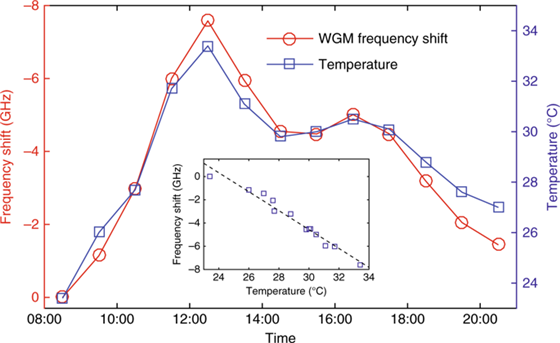 通過12小時的測量,我們獲得了所選諧振模式的頻移圖(如圖3所示) ,封裝WGM傳感器的共振頻率偏移與商用溫度計的結果匹配良好,并且與溫度變化具有線性關系(圖 3插圖)。兩條曲線的小偏差主要來自激光頻率的不穩(wěn)定性,通過優(yōu)化激光電流驅(qū)動器和TEC控制器的電路設計可以將偏差最小化。