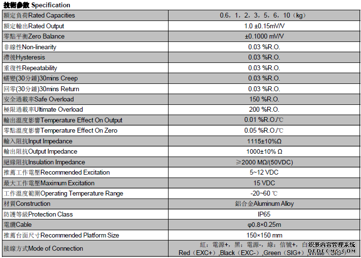 額定輸出;1.0 ±0.15mV/V