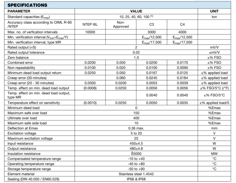 CSPM25t CSP-M 25t梁式稱重傳感器用于壓縮稱重秤,非常精確的設(shè)計(jì),典型的非線性為滿量程的0.025%。由合金和不銹鋼制成,具有從灌封到焊接密封的不同程度的密封。單端梁式稱重傳感器安裝為懸臂,一端為剛性,另一端施加載荷。雙端梁式稱重傳感器安裝在任一端并加載在中心。容量范圍從10克到超過100,000磅。桶秤和地磅 ·容器稱重 ·汽車平衡。單點(diǎn)稱重傳感器: 單點(diǎn)稱重傳感器是力矩補(bǔ)償?shù)?,這意味著您可以將平臺(tái)安裝到規(guī)格表上列出的最大尺寸,并將重量放在盤片上的任何位置并獲得準(zhǔn)確的讀數(shù)。主要由鋁和不銹鋼制造,但一些制造商也用合金鋼制造它們。容量范圍從300克到1,000公斤左右平臺(tái)秤 ·計(jì)數(shù)秤 ·容器灌裝秤。