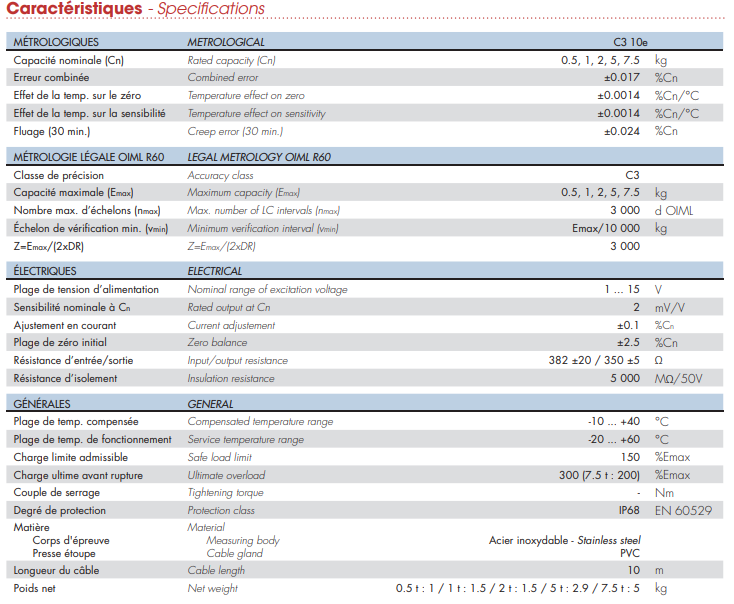 法國Scaime稱重傳感器ZA30X-500KG產(chǎn)品參數(shù)圖: