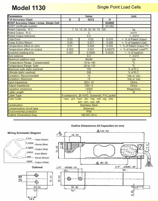 1130-30kg 稱重傳感器tedea 1130-15KG 1130-7KG傳感器技術(shù)參數(shù)圖: